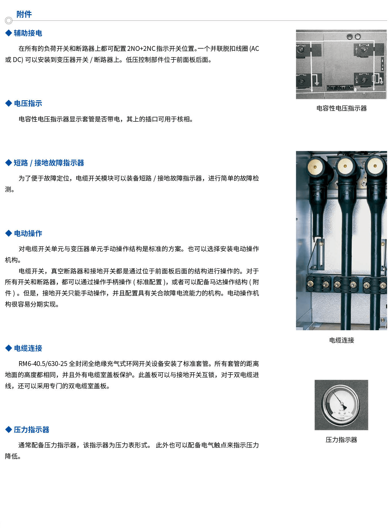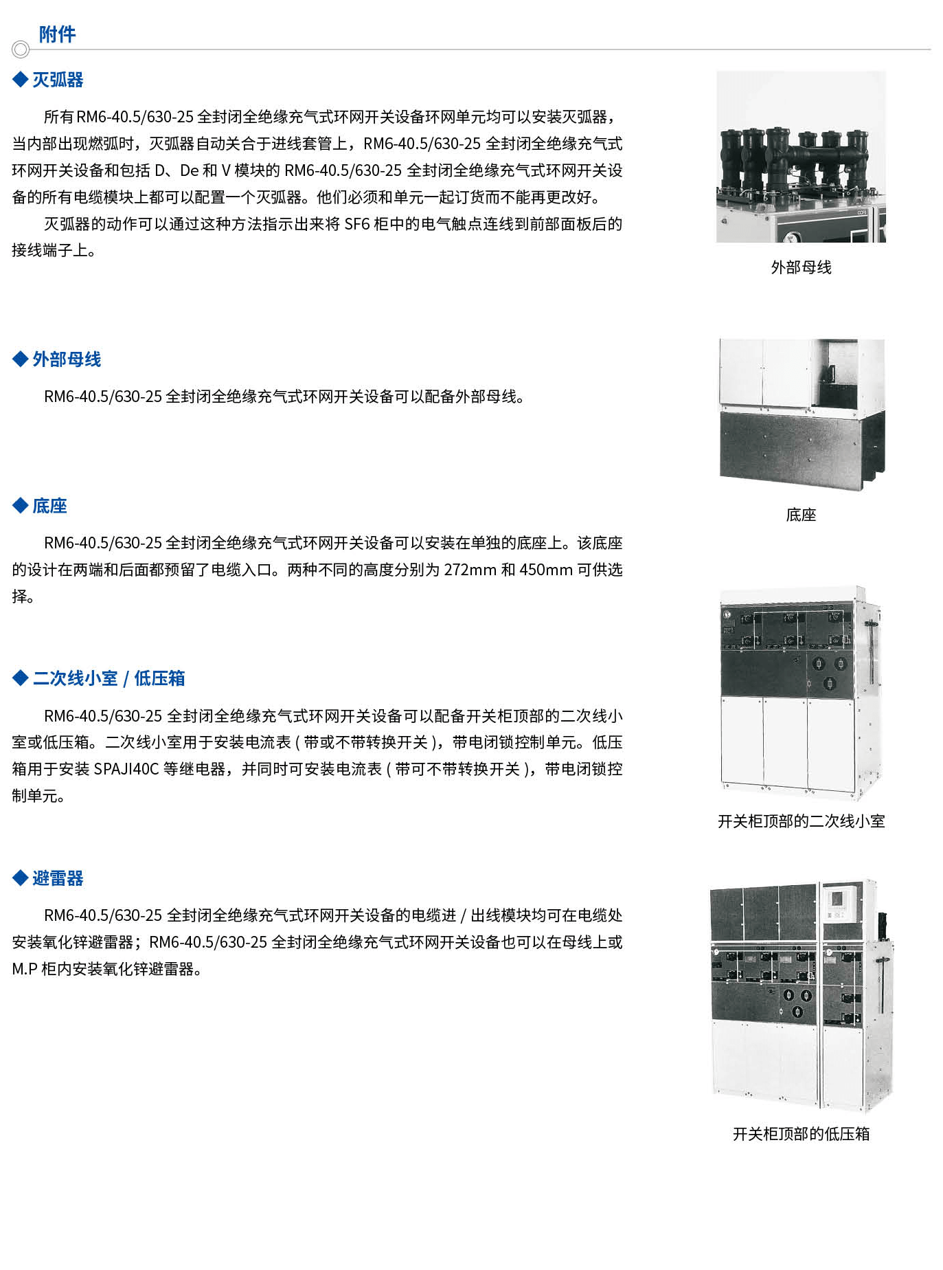 RM6-40.5/630-25全封閉全絕緣充氣式環(huán)網(wǎng)開關(guān)設備,廣泛用于35kV/24kV配電系統(tǒng),是城鄉(xiāng)各類用戶變配電系統(tǒng)的首選開關(guān)產(chǎn)品。開關(guān)柜為模塊化單元模式,可根據(jù)不同用途進行組合:由固定式單元組合與可擴展型單元兩大類,滿足各種變電站對緊湊型開關(guān)柜靈活使用的需要。