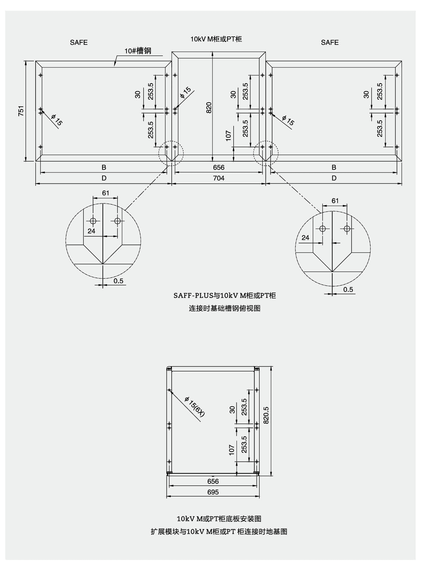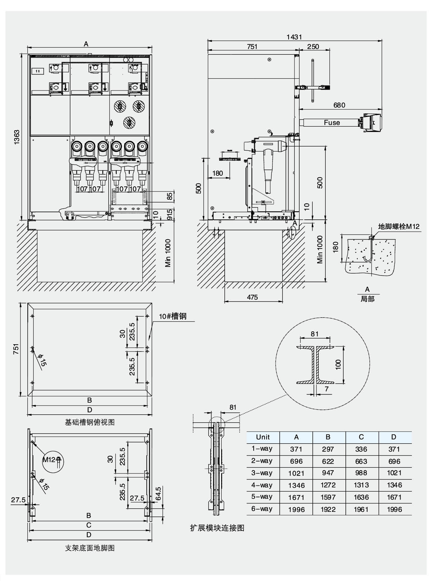 SRM6-12系列充氣式開關柜安裝在一個鍍鋅板框架上,開關單元在SF6氣箱內,氣箱由抗腐蝕和無磁性3mm厚不銹鋼板制成。SF6氣箱是一個“密封壓力系統”在正常工作環境下可運行20年。SF6氣體正常工作時壓力為0.15~0.4br。氣箱裝有壓力釋放裝置,當壓力過高時,保證氣體能從底部或后部釋放。