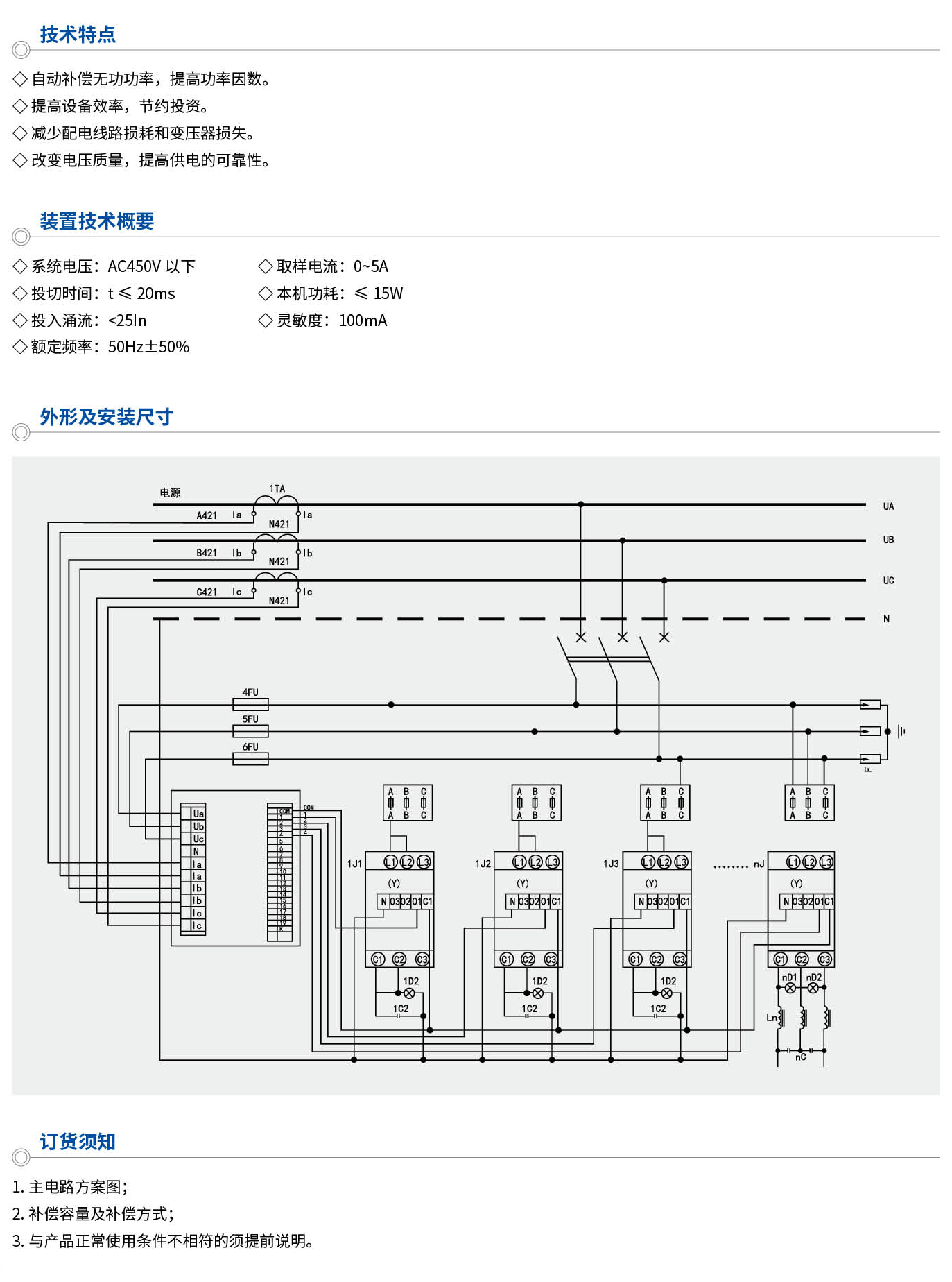 由于本裝置能有效改善用電負荷的功率因數(shù),降低線損,提高變壓器的實際負載能力。具有顯著的節(jié)能效果,同時在系統(tǒng)中采用特定的電抗器,還可以有效防止諧波放大、有效吸收大部分諧波電流,使諧電壓總畸率限值及各次諧波電流含量限值符合國家標準,達到諧波治理的目的。而如果使用普通的接觸器投切電容器組,帶來的將會是大的浪涌電流,慢的補償時間、高的維護費用和短的使用壽命,因此,我們建議用戶在以下場合,能優(yōu)先考慮使用動態(tài)無功補償裝置。如:工礦企業(yè)的變電所、生產(chǎn)車間及民用建筑等的低壓電網(wǎng)中,特別適合負荷經(jīng)常變化,無功功率不穩(wěn)定的輸配電系統(tǒng)。本產(chǎn)品符合:GB/T15576-2008《低壓成套無功功率補償設備》、IEC60439《低壓成套開關設備和控制設備》等標準。